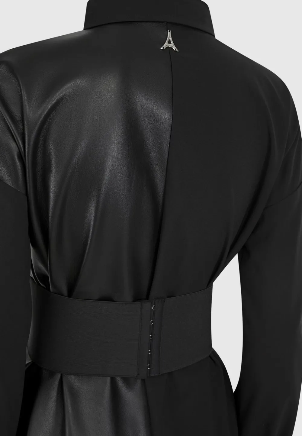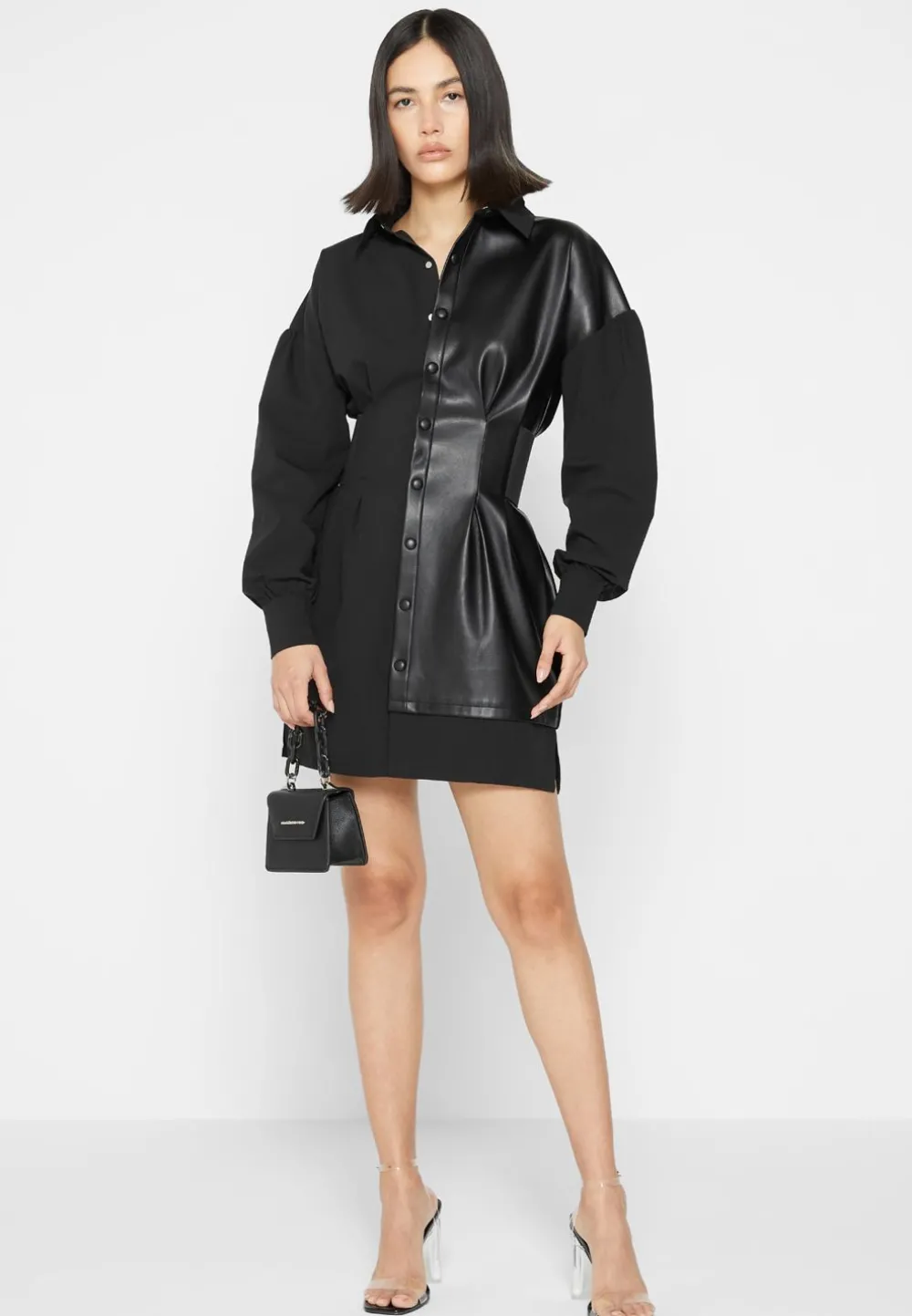 Achieve The Perfect Balance Of Stylish And Fashion Forward With The Half Vegan Leather Shirt Dress. Crafted From Half Vegan Leather And Featuring A Cinch Waistband And Oversized High Low Hem, This Dress Is Sure To Become A Wardrobe Staple.