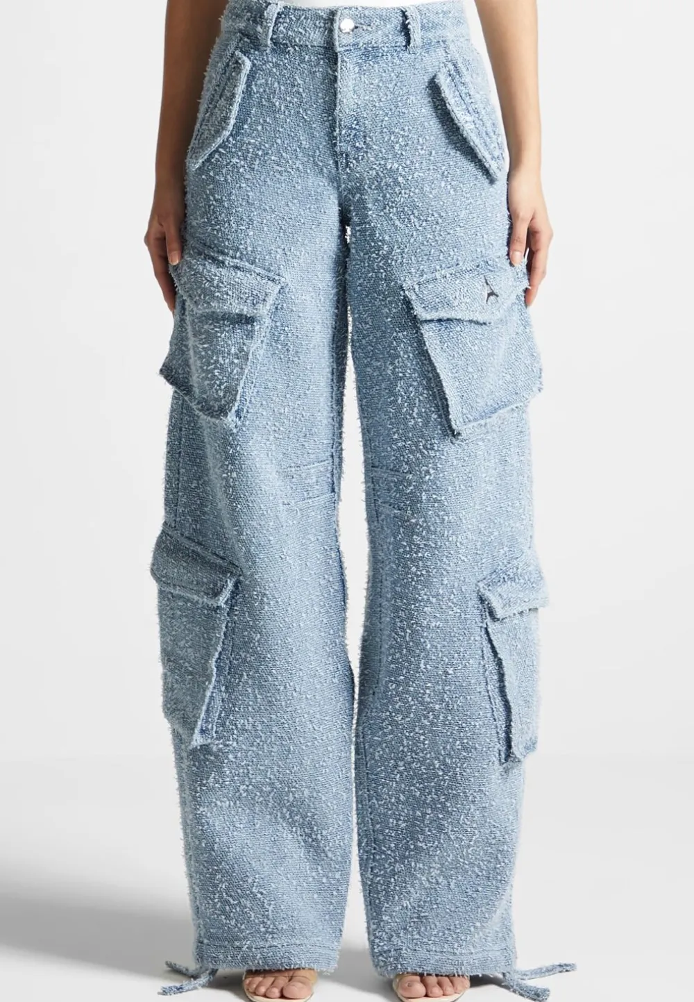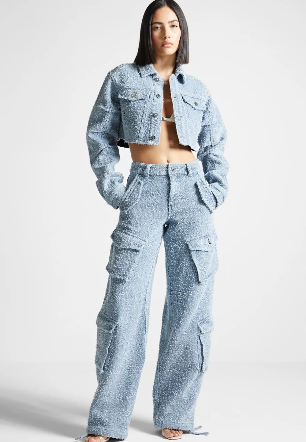 Our Boucle Denim Cargo Pants Are A Fashionable And Comfortable Option For Any Wardrobe. Crafted With Textured Fabric, They Offer A Unique Style That Is Both Eye-Catching And Comfortable. Whether You’Re Heading For A Night On The Town Or Just Lounging Around, These Pants Will Help You Look And Feel Great.
