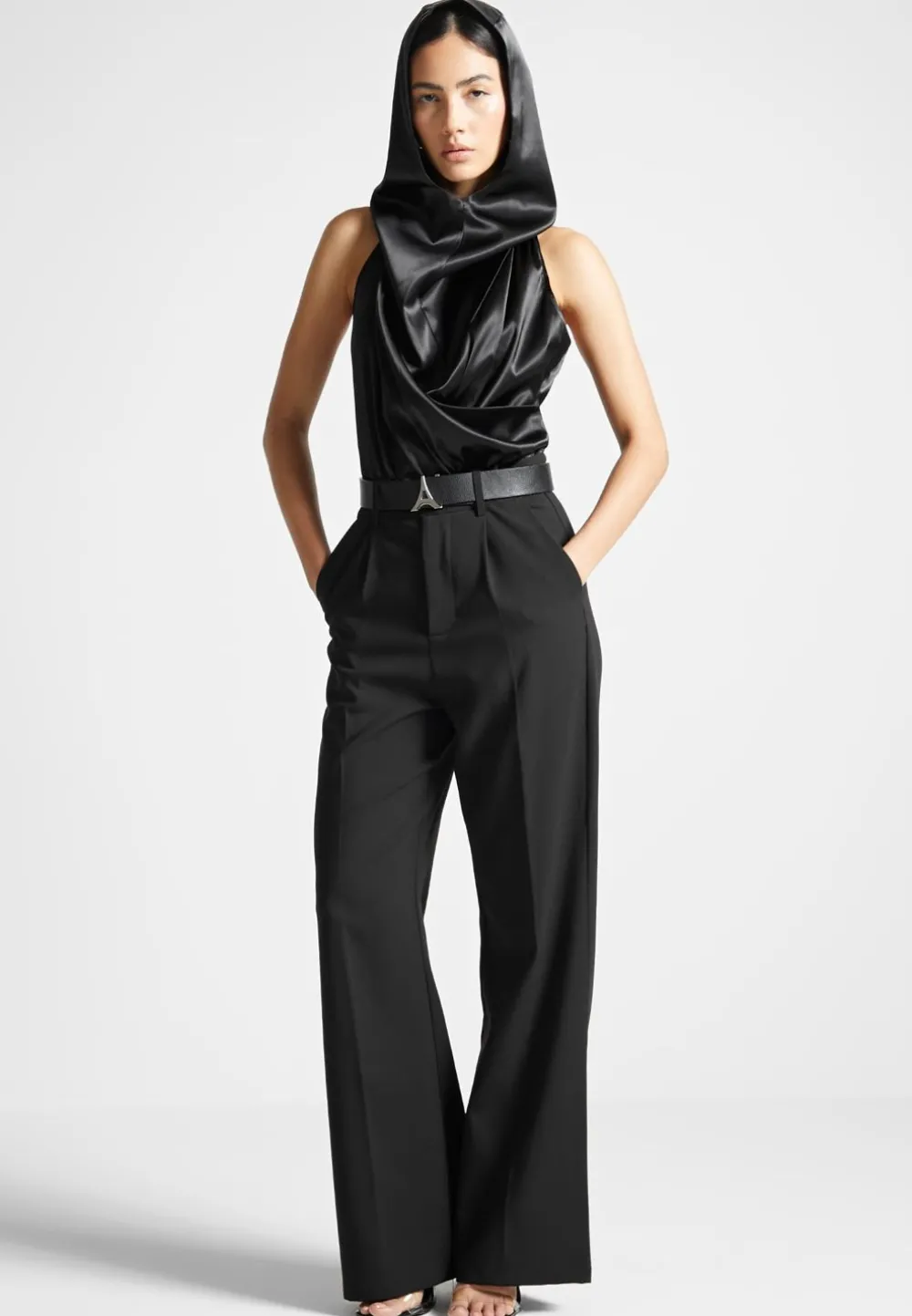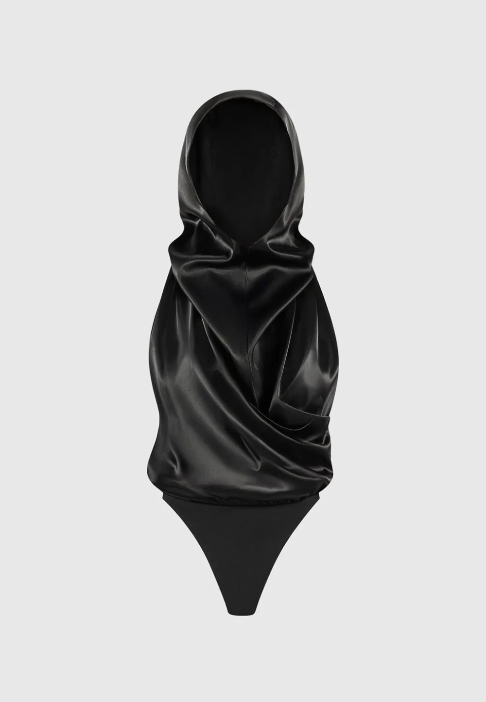 This Stylish Hooded Cowl Neck Satin Wrap Bodysuit Is Ideal For Any Night Out. Its Flattering Silhouette Ensures You’Ll Look Your Best, Perfect For When You Want To Make An Impression. The Detachable Hood Adds An Elegant Twist To An Already Chic Bodysuit.