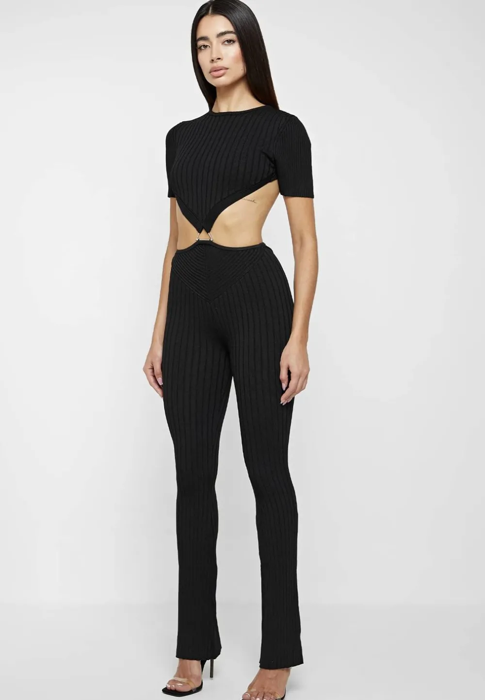 Perfect For Nights Out, This Jumpsuit Features An Exposed Back And Carefully Placed Contour Panels At The Waist To Mimic A Cinched Waist.