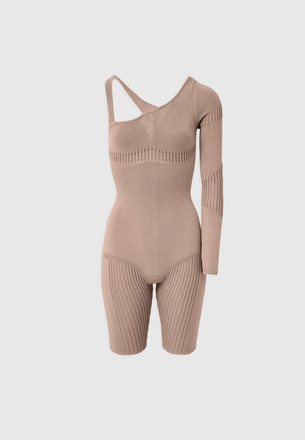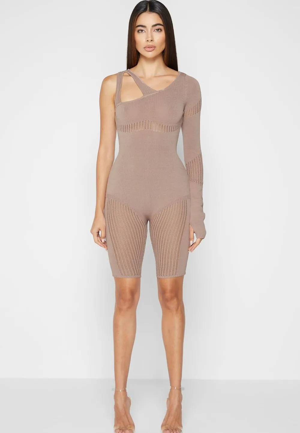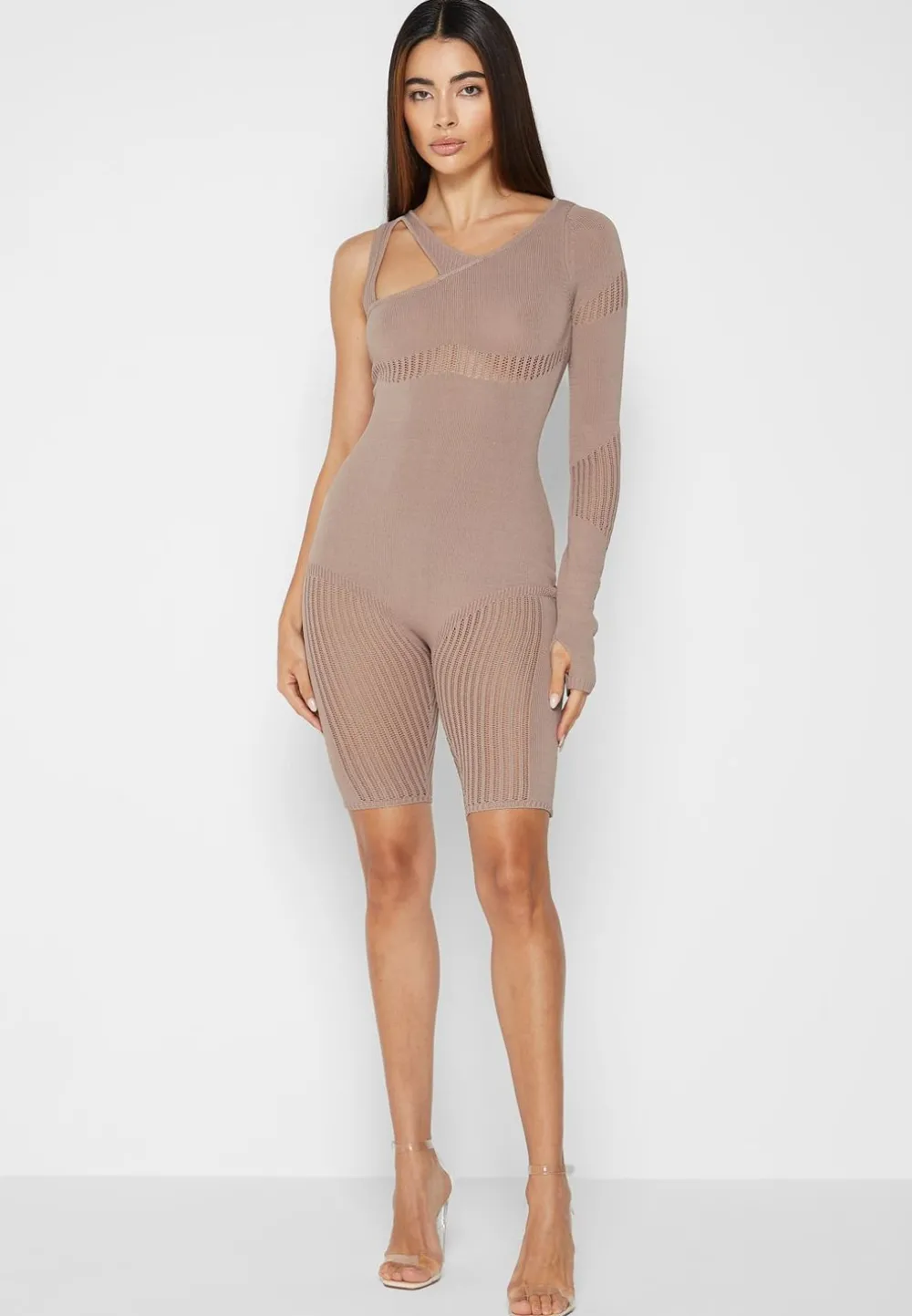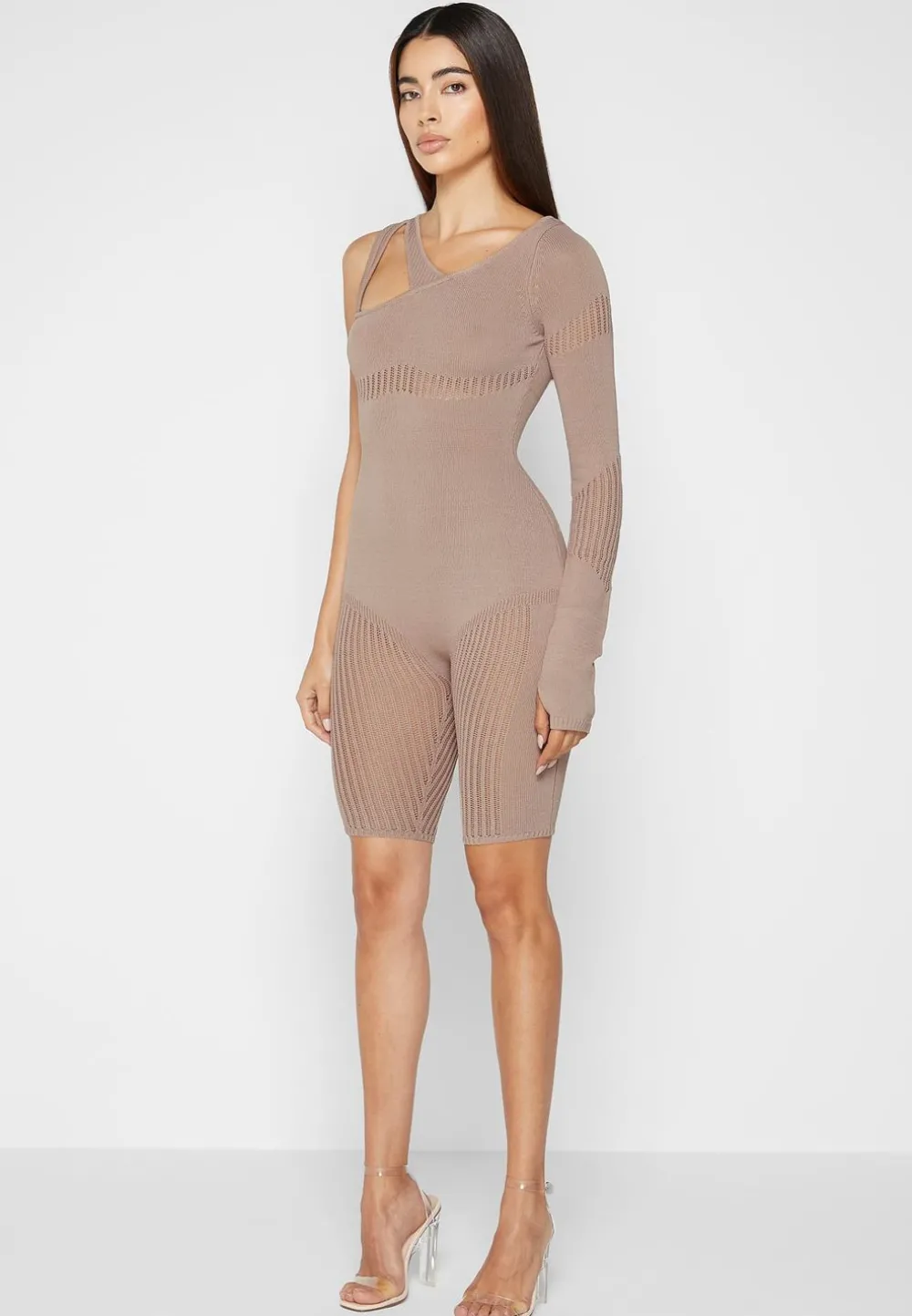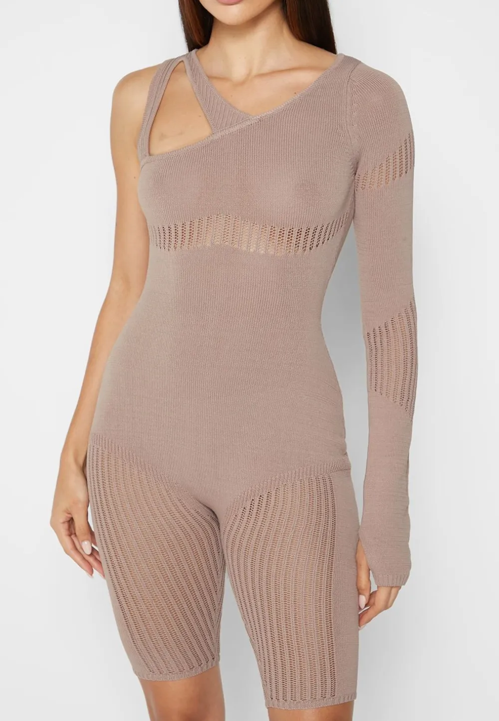 The Asymmetric Neckline On This Playsuit Instantly Draws Attention To The Bust. The Wide Knit Contrasting Accentuates The Natural Contours Of The Body.