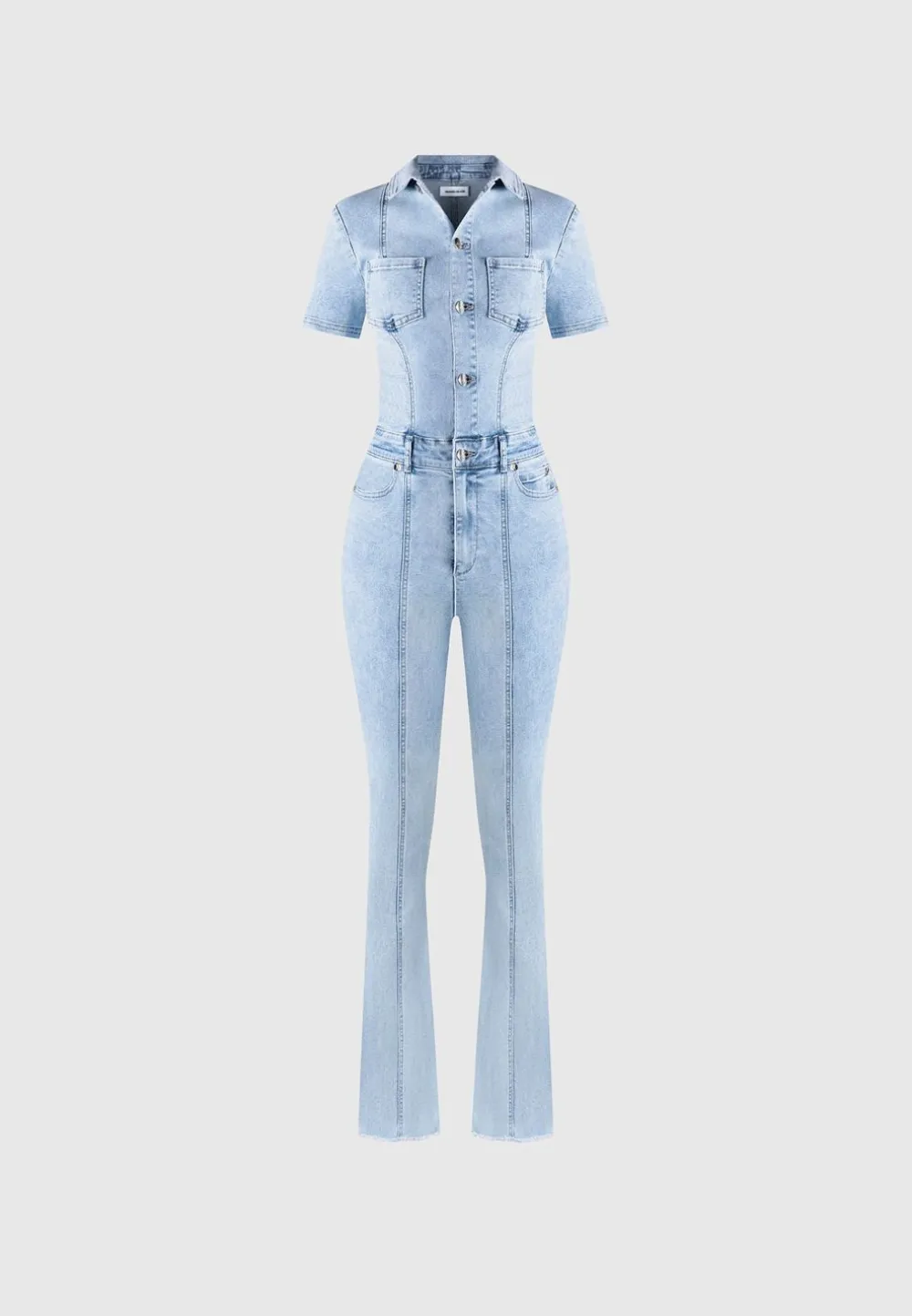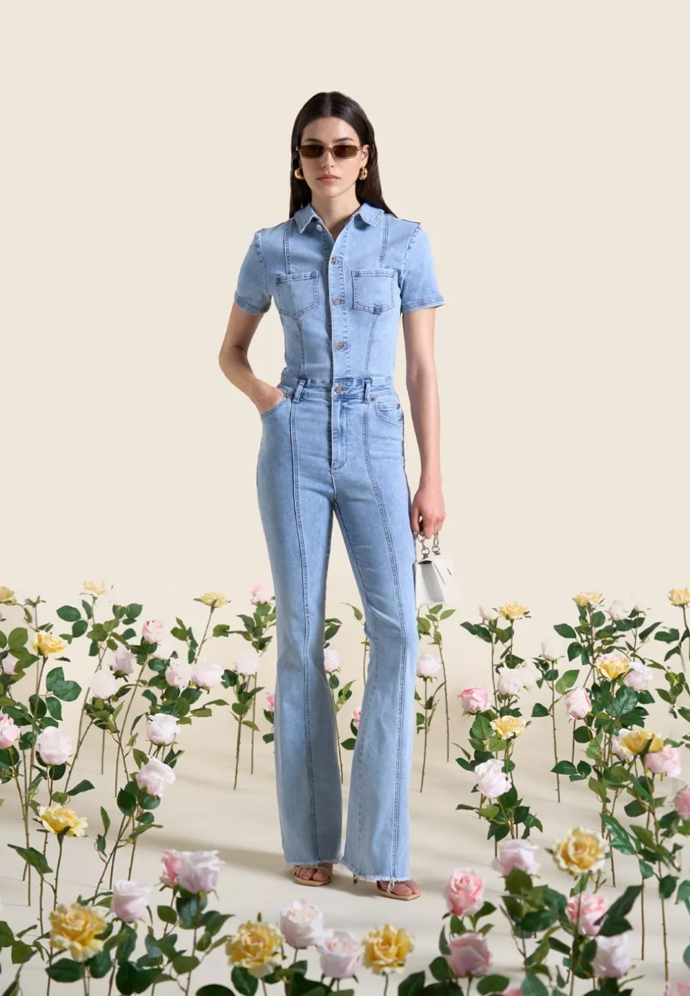 Expertly Crafted And Designed For Ultimate Comfort And Style, Our Mini Flared Denim Jumpsuit In Mid Blue Is A Must-Have Addition To Your Wardrobe. Made With Stretch Fabric For A Figure Flattering Fit, And Featuring A Flared Silhouette, It’s The Perfect Piece For Any Occasion. Upgrade Your Look With This Jumpsuit.