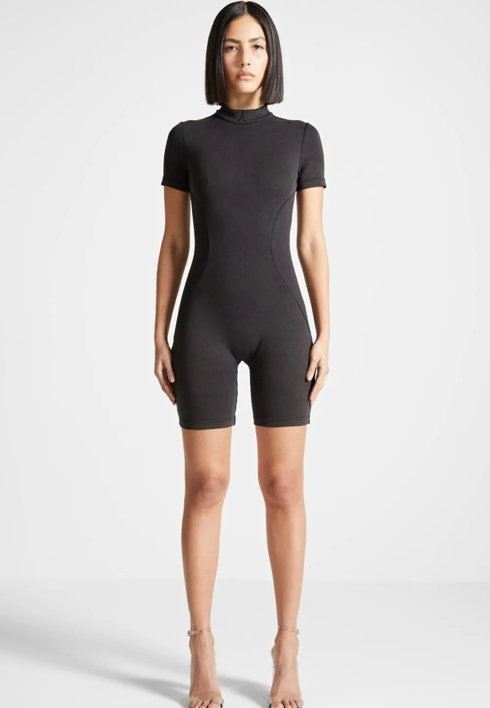 This Mock Neck Playsuit Features A Sleek Mock Neck And Contour Lines, Creating A Sleek And Stylish Silhouette Perfect For Any Occasion. With Its Timeless Design And Precise Lines, You Can Be Sure To Look Your Best With Minimal Effort.