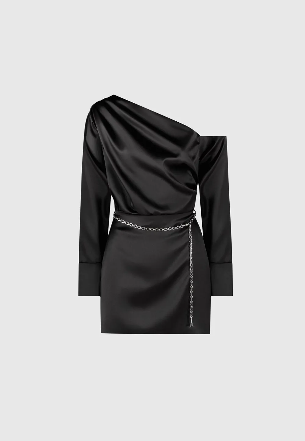 Elevate Your Wardrobe With Our Off Shoulder Draped Satin Mini Dress With Belt. Featuring Drape Detailing And An Asymmetric Neckline, This Dress Exudes Sophistication And Style. Complete The Look With The Included Chain Belt For A Flattering Fit. Expertly Crafted For A Polished, Modern Look.