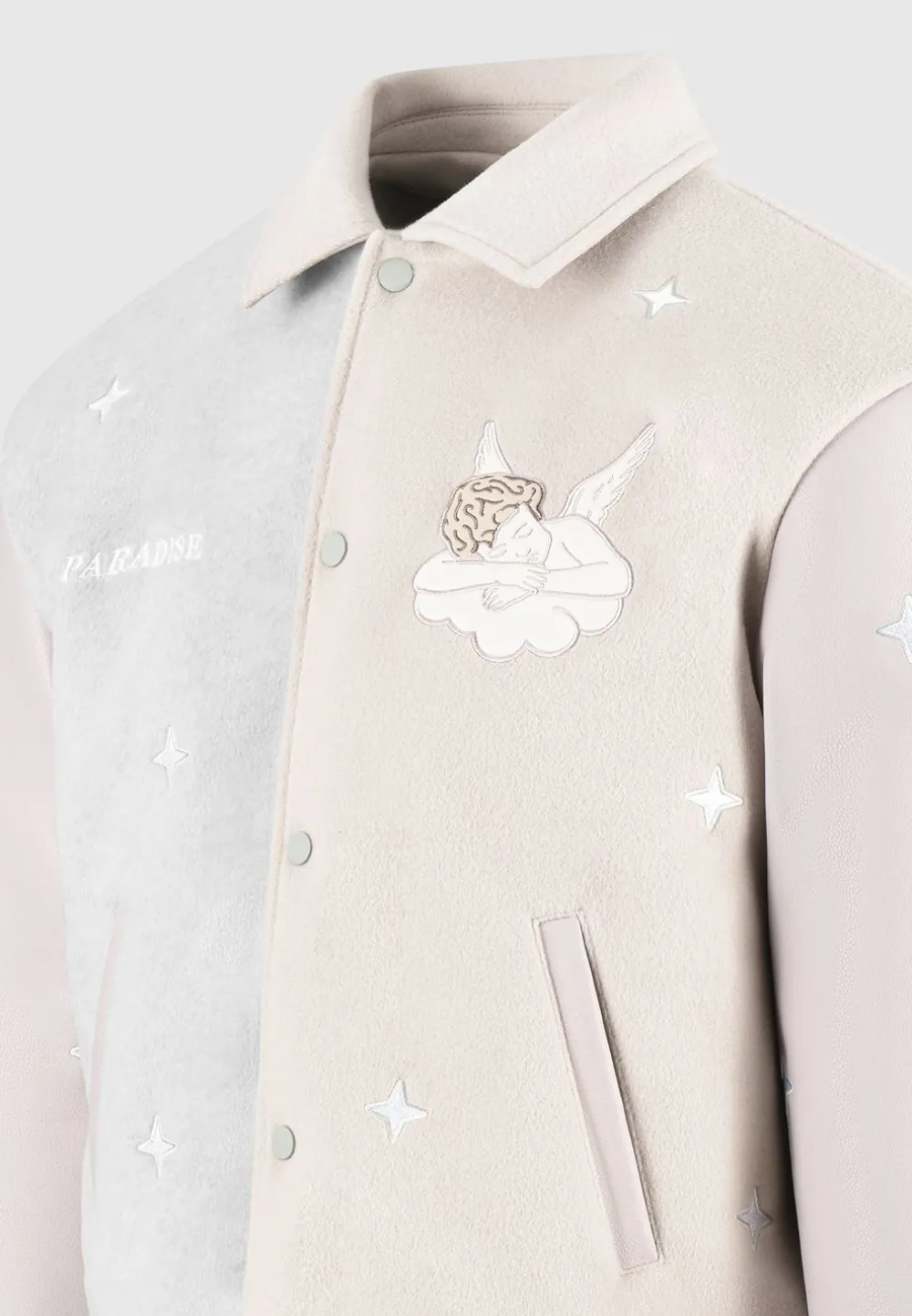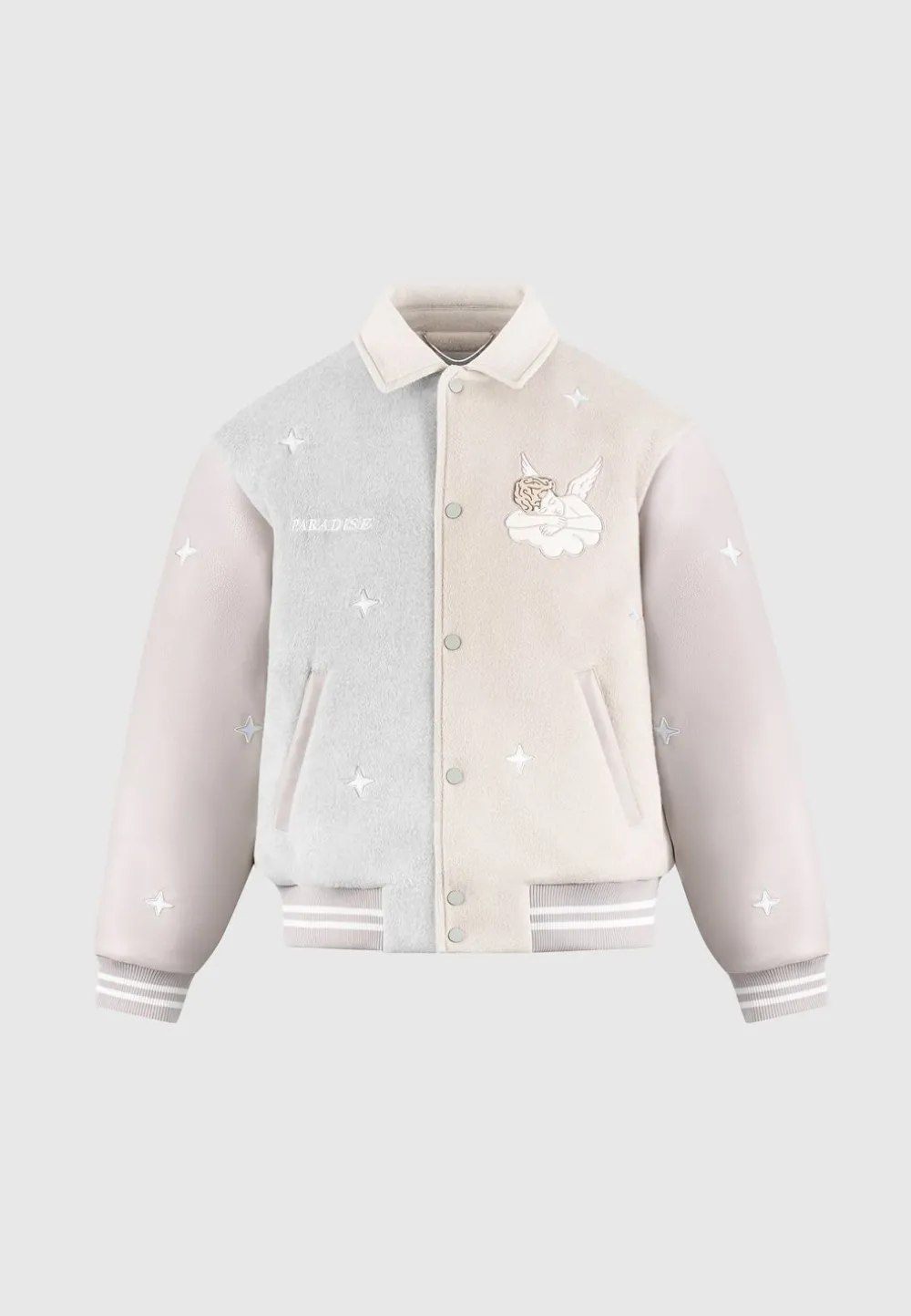 Introducing The Paradise Varsity Jacket, A Versatile And Stylish Addition To Your Wardrobe. With Angel Embroidery, This Jacket Seamlessly Transitions From Day To Night. Its Relaxed Fit Ensures Comfort And Effortless Style. Elevate Your Look With This Must-Have Piece.