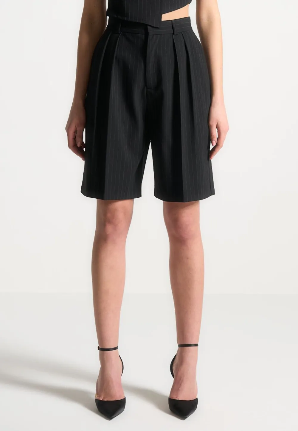 Expertly Crafted With Pleat Detailing And A High-Waisted Design, Our Pinstripe Tailored City Shorts Are The Perfect Addition To Any Professional Wardrobe. Elevate Your Style And Stay Comfortable All Day With These Sleek And Sophisticated Shorts.