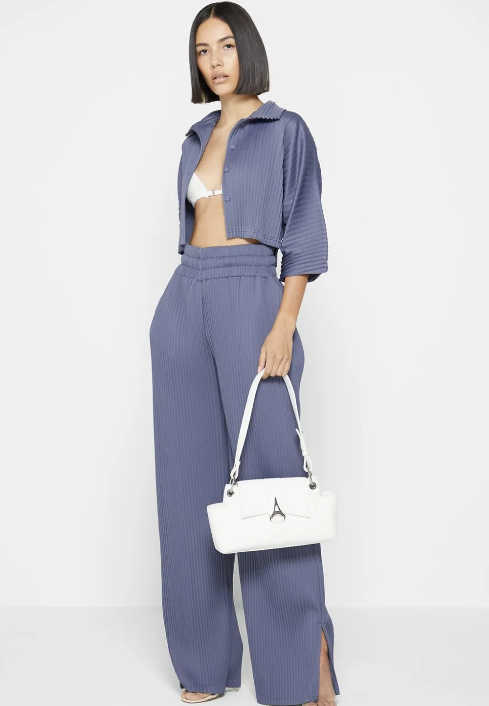 This Off Steel Blue Pleated Cropped Shirt Is The Perfect Top For A Day In The Sun. Featuring A Cropped Waist And Easy Button Down Closure, This Classic Shirt Is A Timeless Piece For Any Wardrobe.