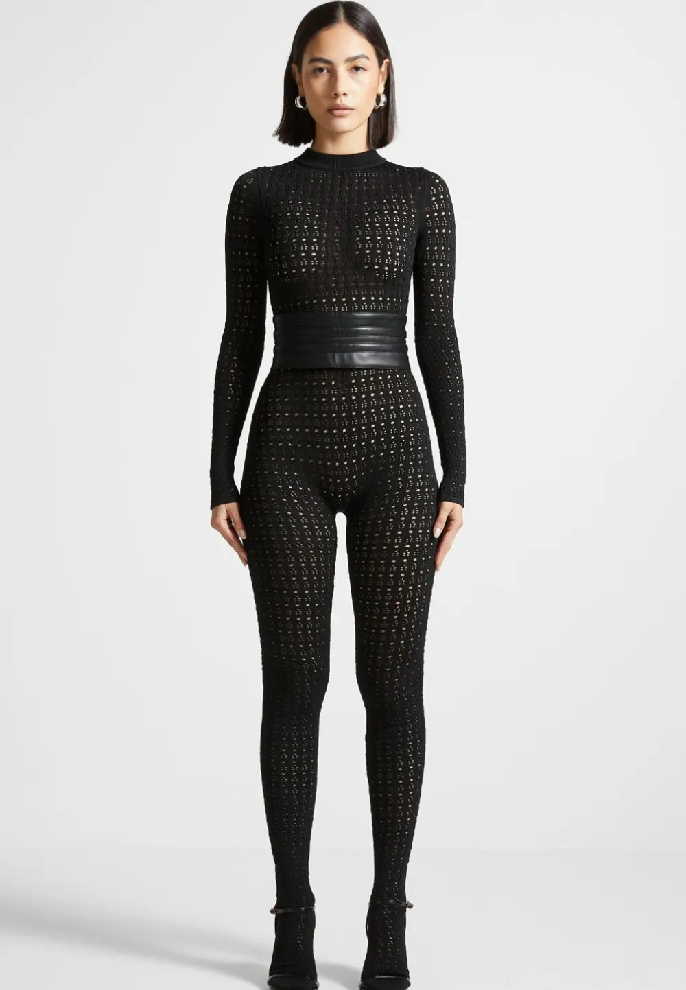 This Classic Black Jumpsuit Is Made From Soft Pointelle Knit And Features A Stylish Belt Cinching At The Waist For A Flattering Fit. Its Distinct Design Thanks To Its Ribbed Texture Accentuates Your Feminine Silhouette.