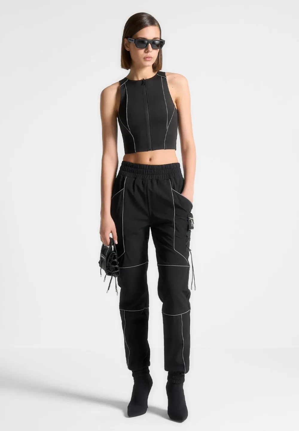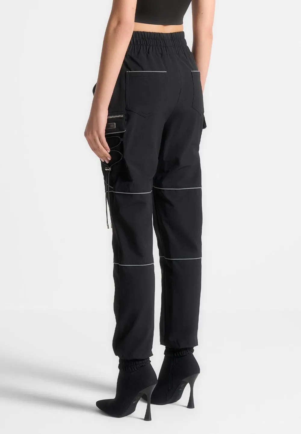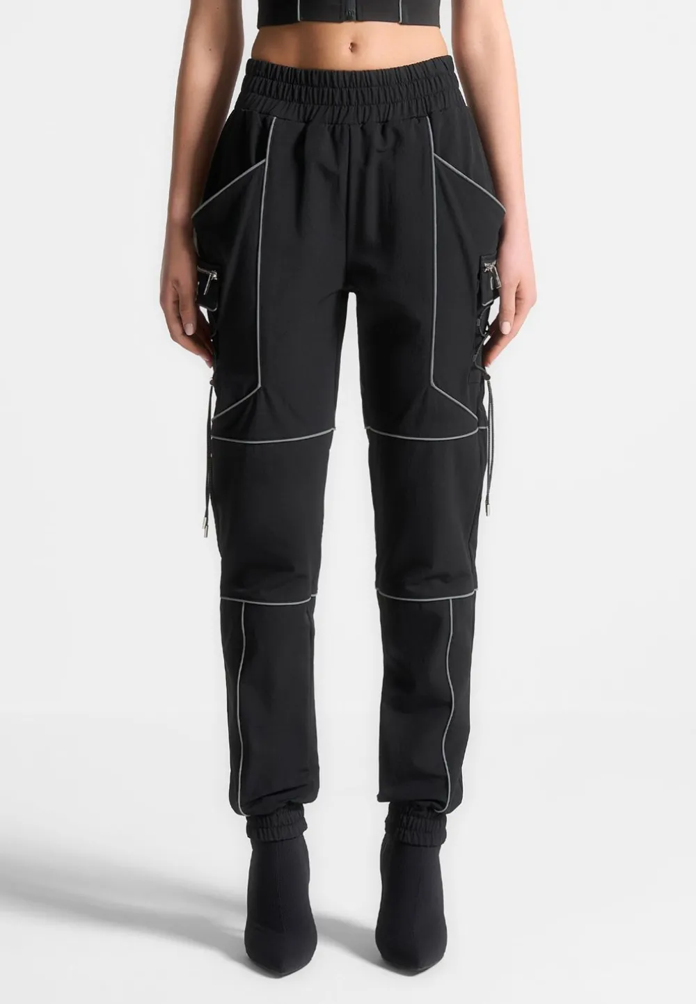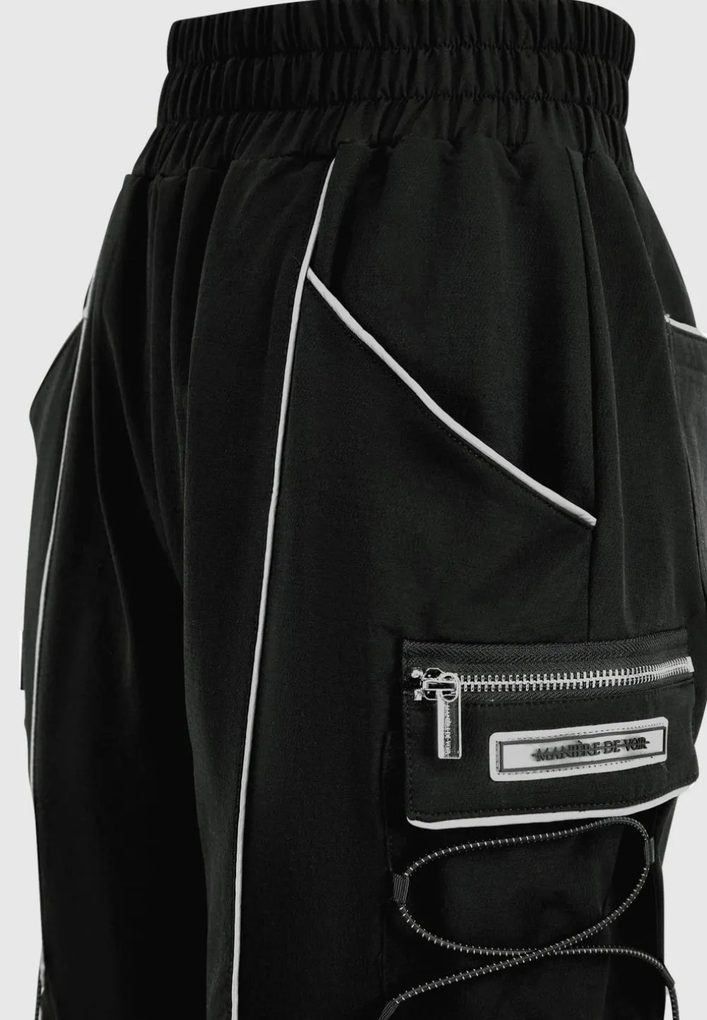 In Our Technical Fabric, The Reflective Piped Cargo Pants Are An Edgy Take On The Street Staple Cargo Pant. The Design Features Reflective Piping On Most Seams And A Reflective Specks Bungee Cord On The Cargo Pockets. The Style Maintains The “Cool” Look With The Manière De Voir Silicone Branding.