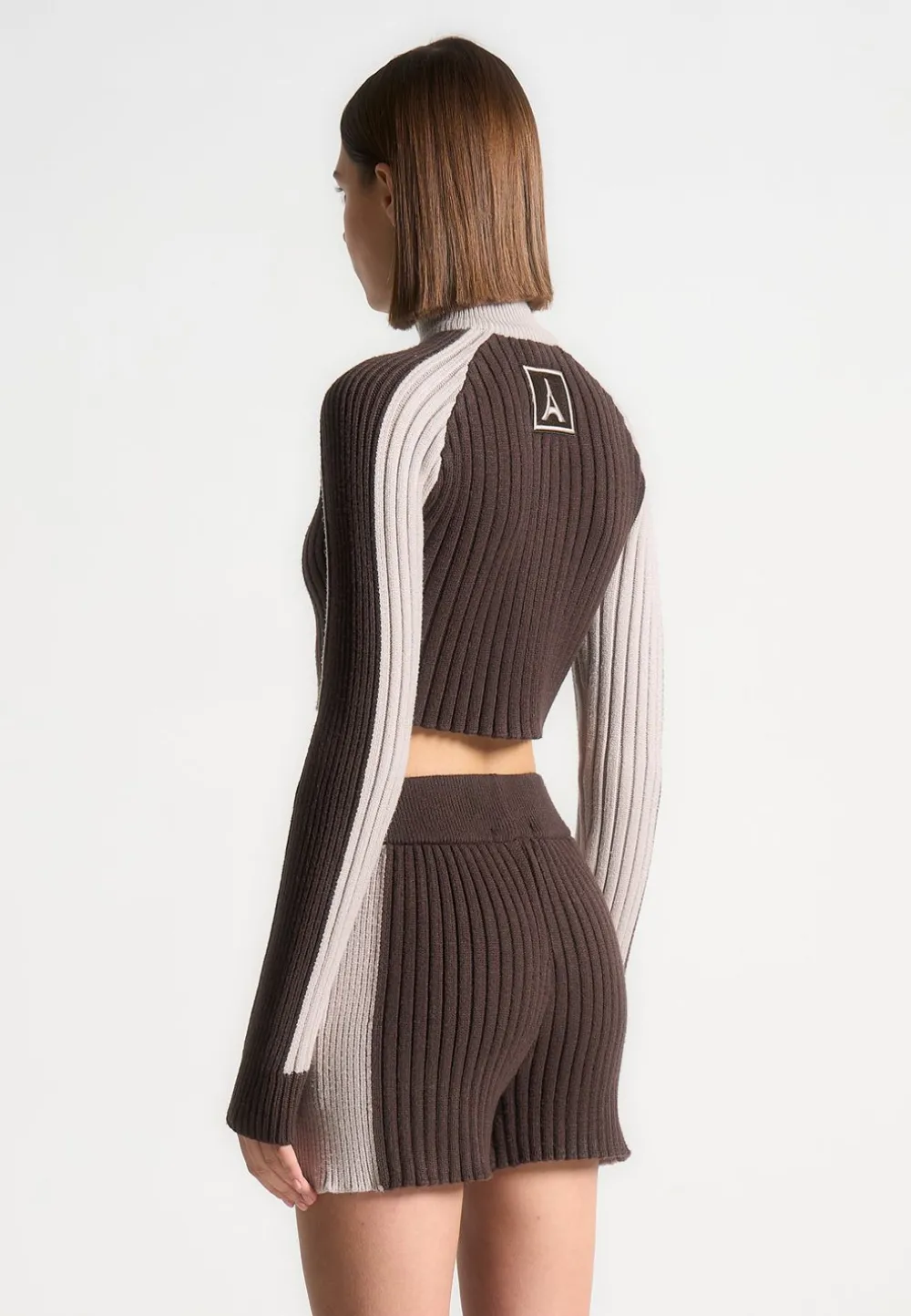 This Rib Knit Track Jacket Features A Soft Touch And Quality Yarn For A Comfortable And Durable Fit. The Ribbed Knit Design Adds A Stylish Touch, While The Funnel Neck Provides Added Warmth. This Fitted Jumper Is Perfect For Any Occasion.
