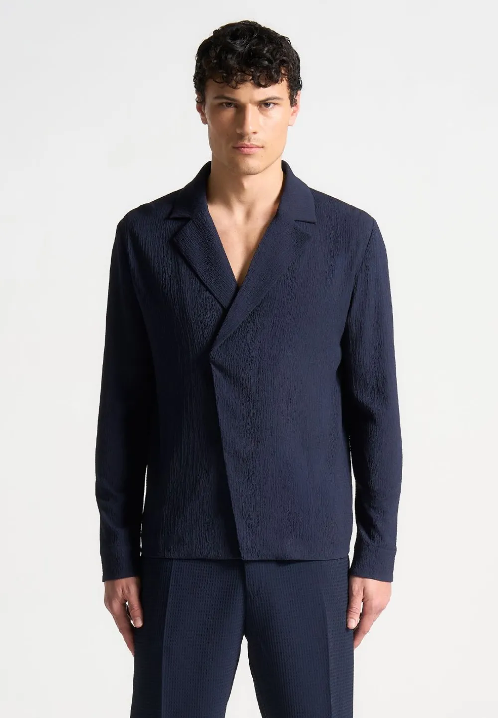 Introducing Our Seersucker Double Breasted Shirt In Navy. This Long-Sleeve Silhouette Presents A Regular Fit With A Relaxed, Open Collar To Ensure Comfortable Wear. With A Secure Internal Button Fastening And Deluxe, Textured Fabric, This Shirt Seamlessly Marries Style With Practicality.