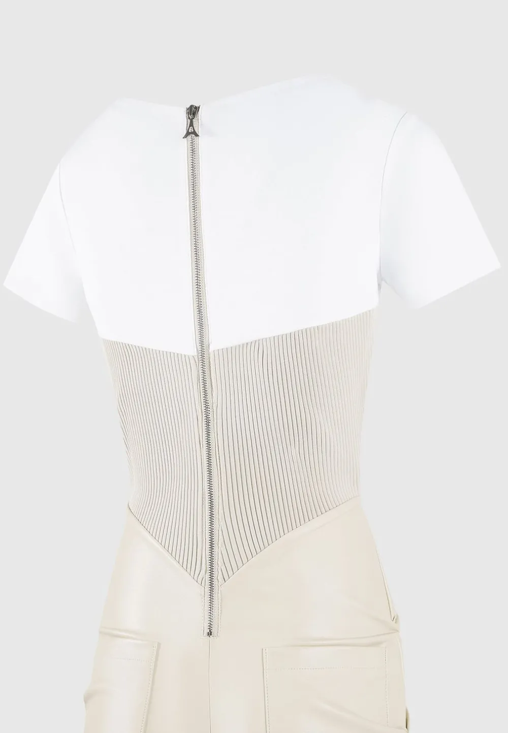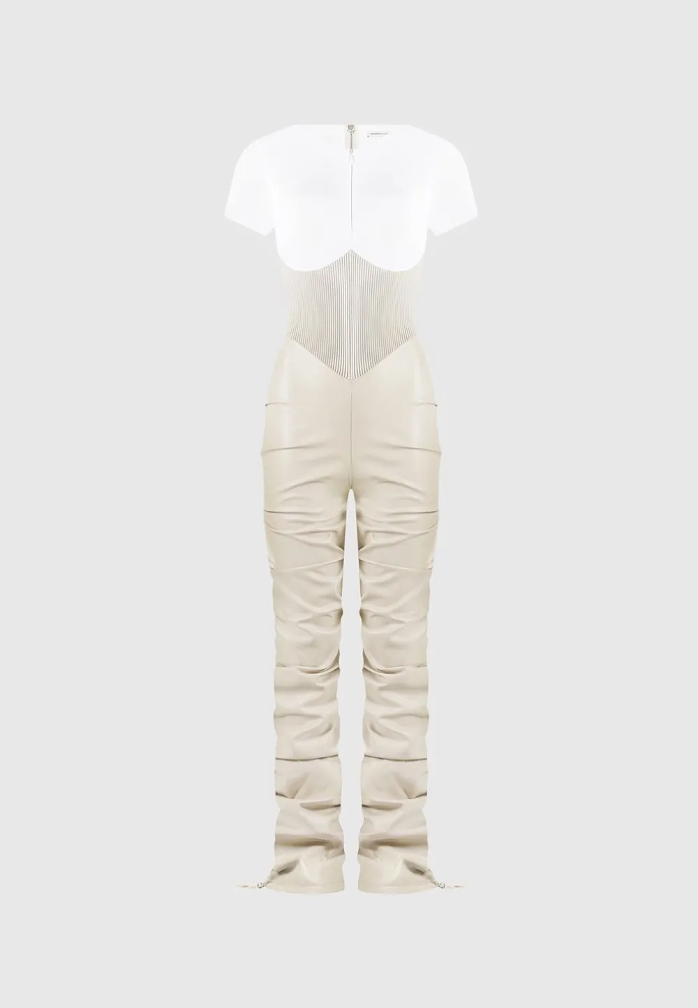 Our Tacked Vegan Leather T-Shirt Jumpsuit Features A Flattering Fit And Cinched Waist Creating A Stunning Ensemble That Effortlessly Combines Fashion-Forward Design. Crafted From High-Quality Vegan Leather, This Jumpsuit Maintains A Luxurious And Edgy Appeal.