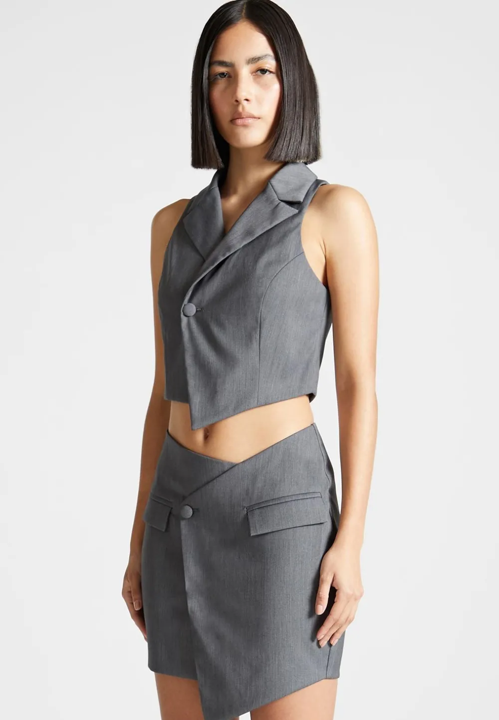 This Tailored Asymmetric Waistcoat Offers Classic And Sophisticated Style With A Modern Touch. Its Cropped Silhouette And Timeless Design Make It Perfect For Styling All Year-Round. A Must-Have Piece For Those Who Appreciate Effortless Elegance.
