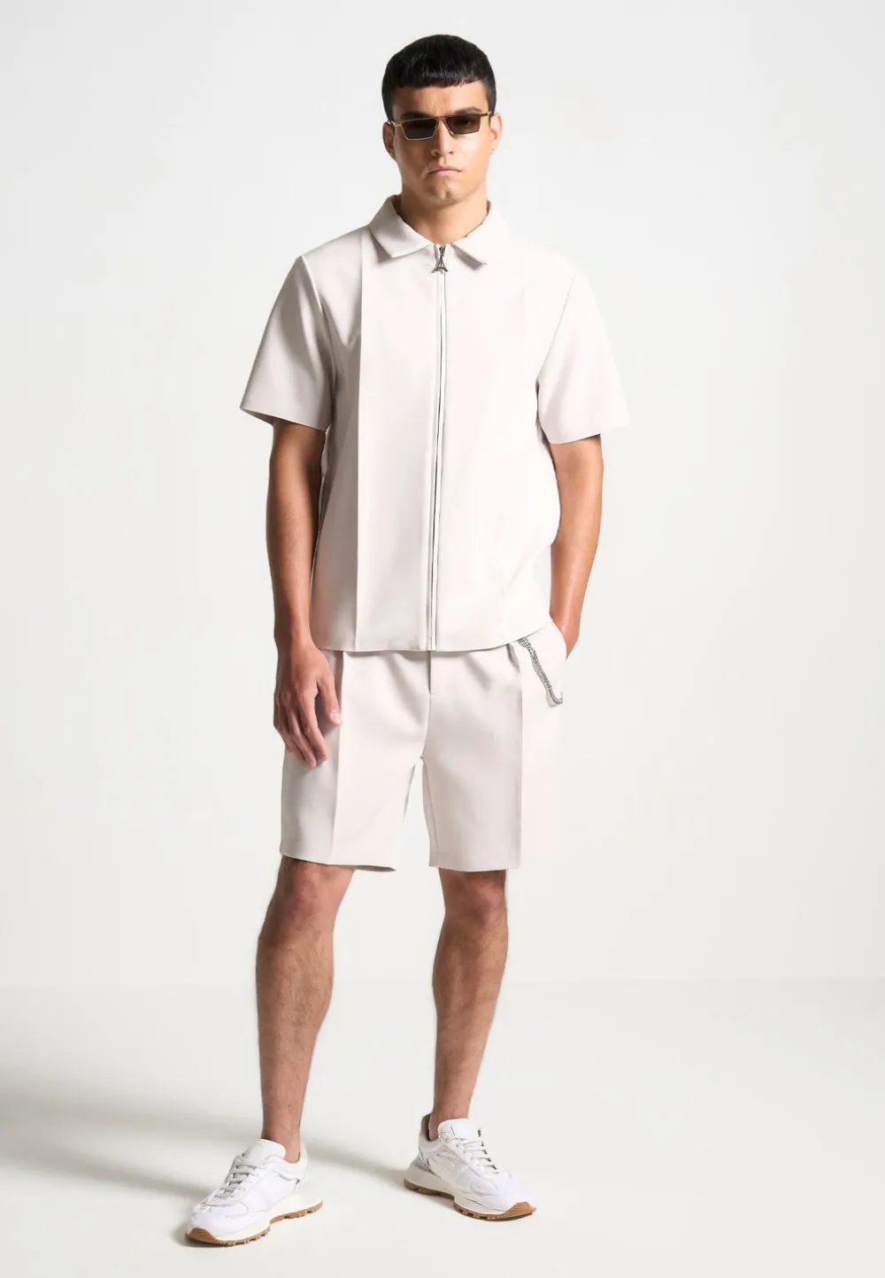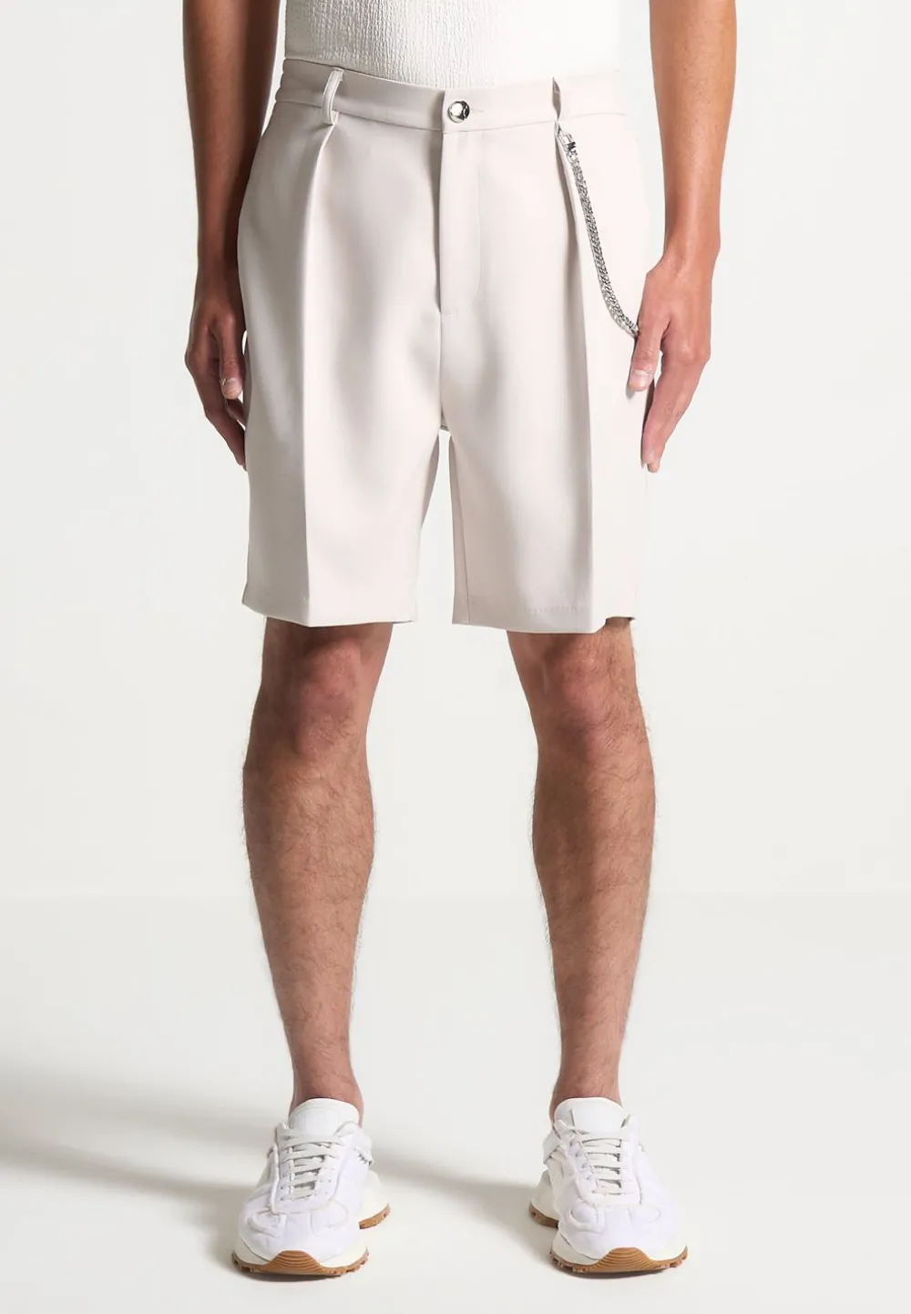 These Tailored Shorts In Stone Are Designed With A Detachable Chain Feature And Silver Hardware. The Embossed Silver Button Adds A Refined Touch, While The Side Slip Pockets Provide Convenience. With A Pleat To Crease Design, These Shorts Create A Sophisticated And Polished Look.