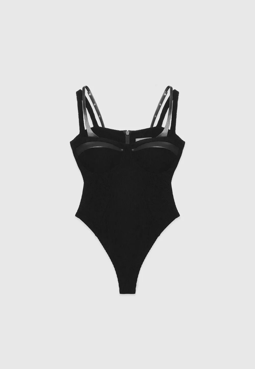 With A Flattering Neckline, This Bodysuit Enhances Your Bust And The Twin Straps Provide Additional Security. This Bodysuit Also Has Textural Contrast With The Vegan Leather Against The Ribbed Fabric.