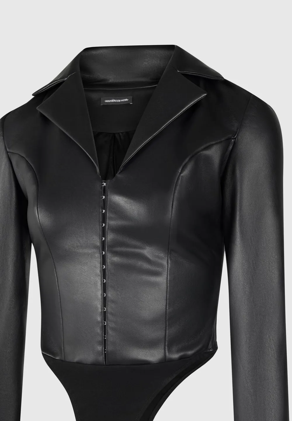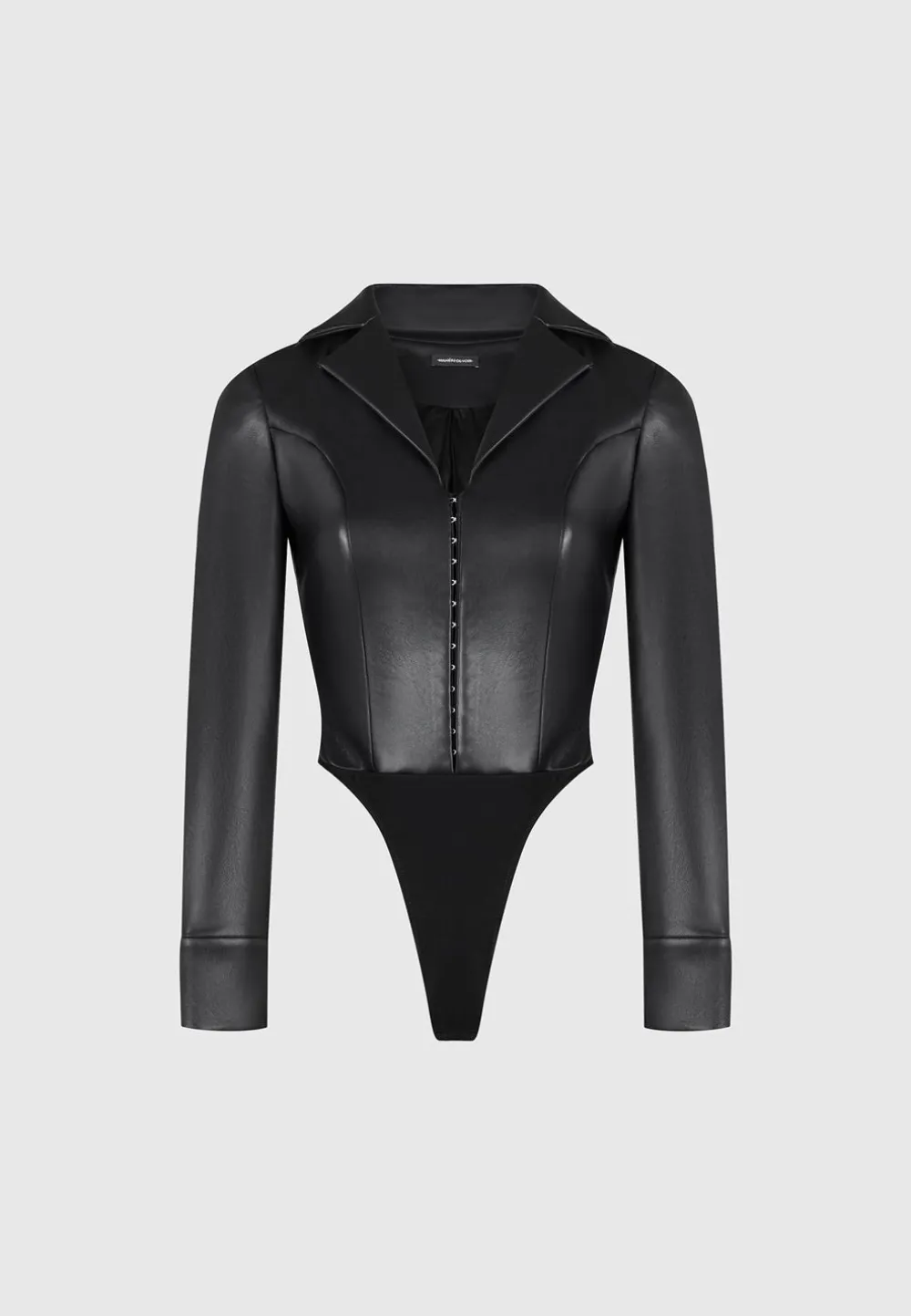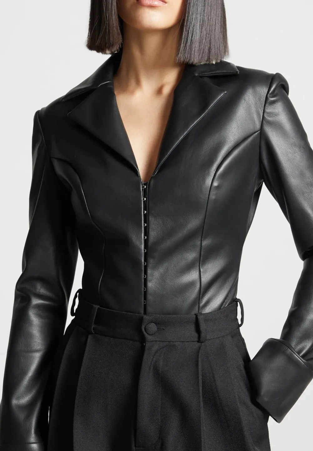 Look Stylish And Stay Comfortable In This Vegan Leather Blazer Bodysuit. Featuring Contour Detailing, It Is Made Of Premium Fabric To Provide A Perfect Fit And Feel. Perfect For Day Or Night Wear – It Is The Ideal Versatile Piece To Keep Your Wardrobe Fresh.