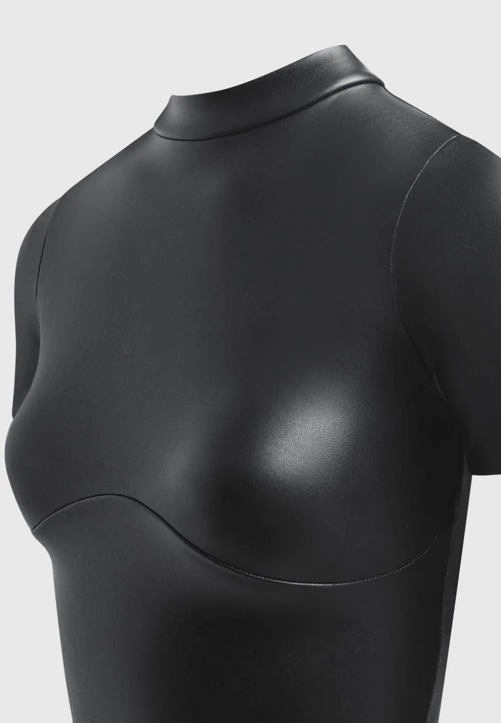 This Vegan Leather Bodysuit Is Designed To Accentuate Your Form With Its Classic Design And Contour Bust Detailing. The Black Colour And Mesh Gloves Provide A Sophisticated And Alluring Look That You Can Wear With Confidence. Perfect For A Night Out Or Your Next Special Event.
