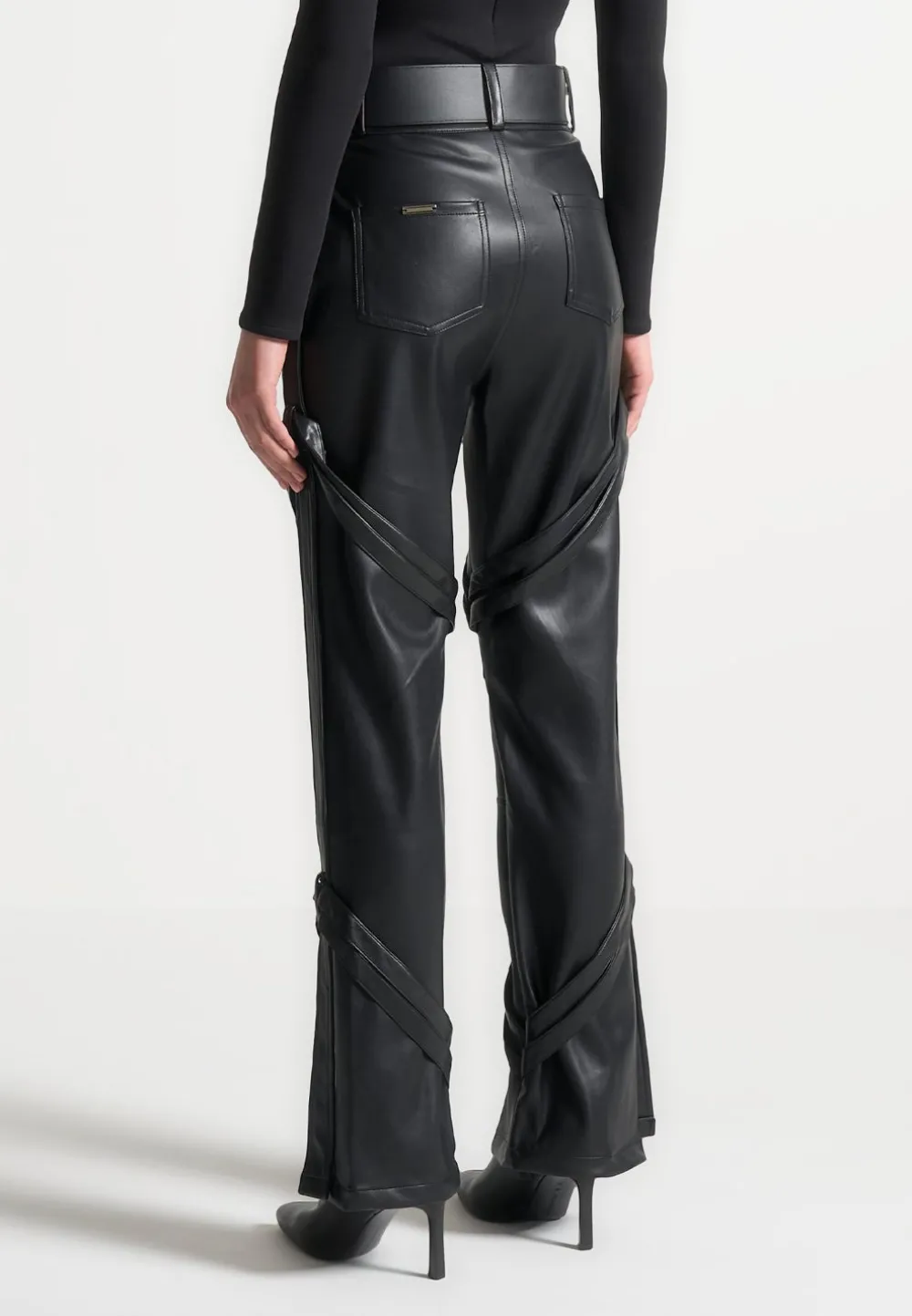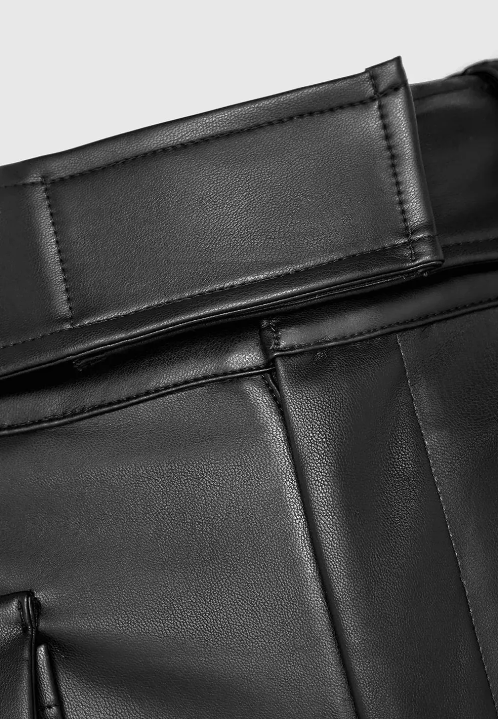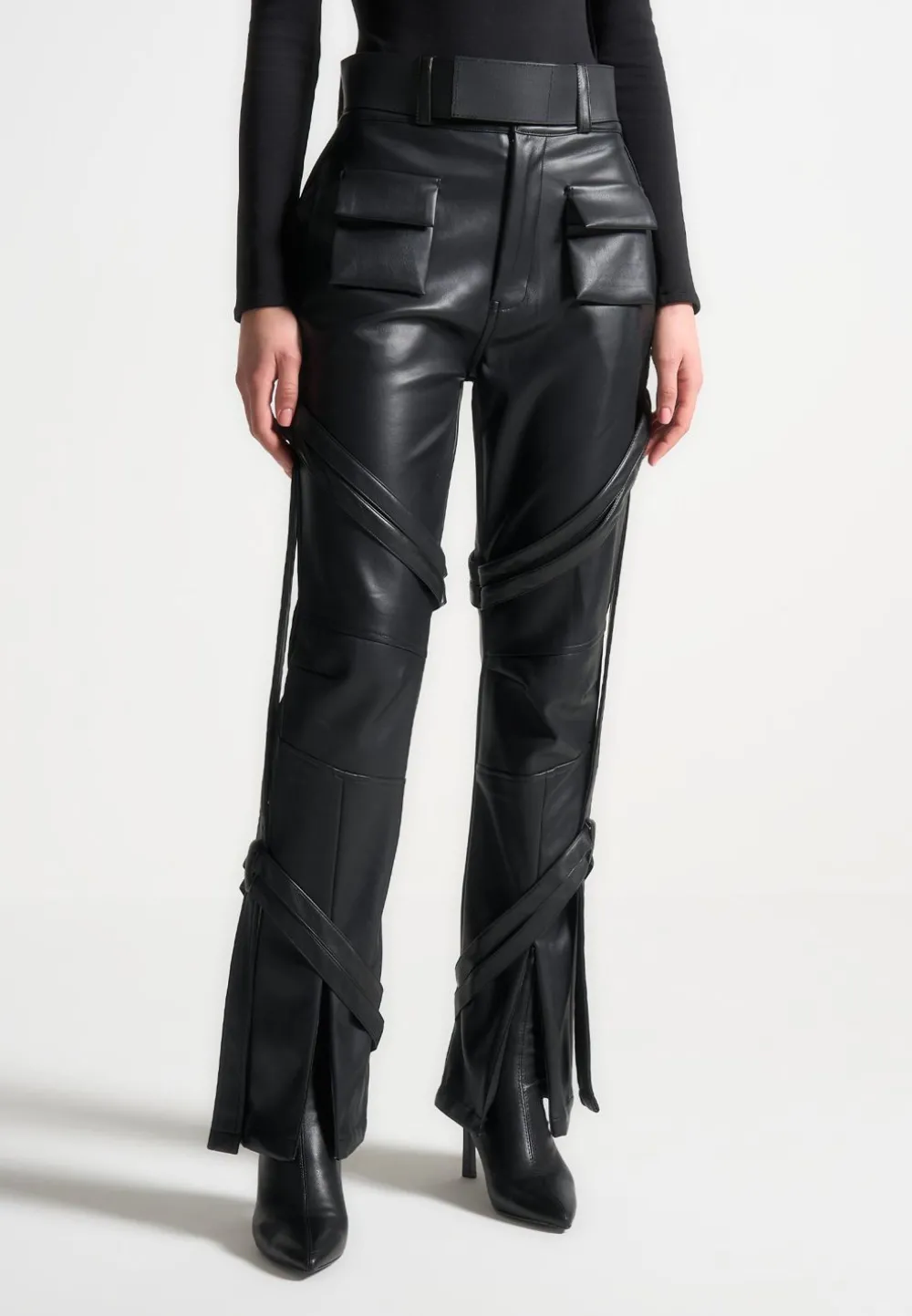 The Vegan Leather Carpenter Cargo Trousers Have A Casual Feel Thanks To The Sizeable Cargo Pockets, But Are Designed With Just As Much Consideration As A Going Out Style. Made From Vegan Leather With A Straight Leg, Deep Waistband And Carpenter Belt Detailing. The Invisible Zips At Hem Can Be Used For Versatile Styling For Both Casual And Dressy Looks.