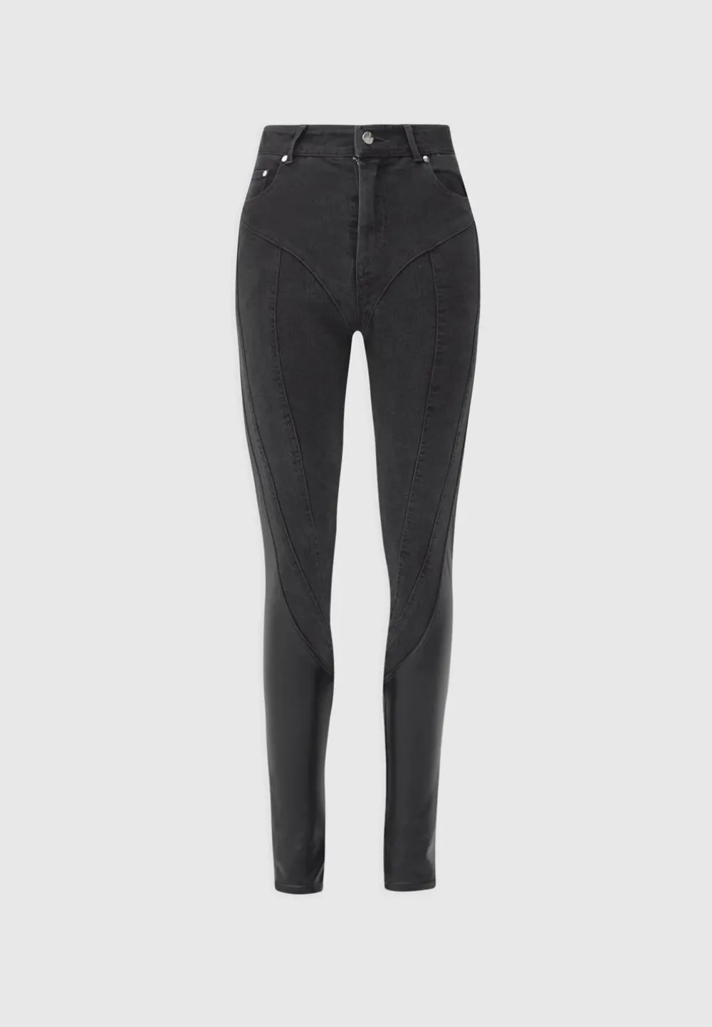 Capturing The Essence Of High Fashion, These Carefully Crafted Jeans Feature A Spiral Effect Using Contrast Vegan Leather That Contours And Lifts The Body. The Waistband Is Adjustable For A Custom Fit To You. These Jeans Are Perfect On A Night Out Paired With Heels.