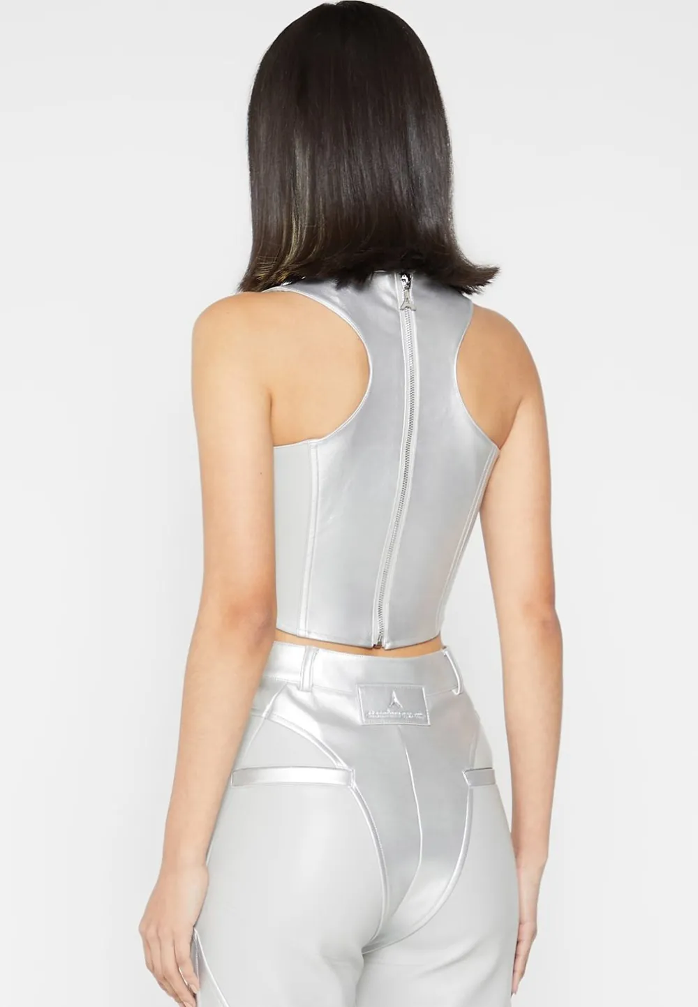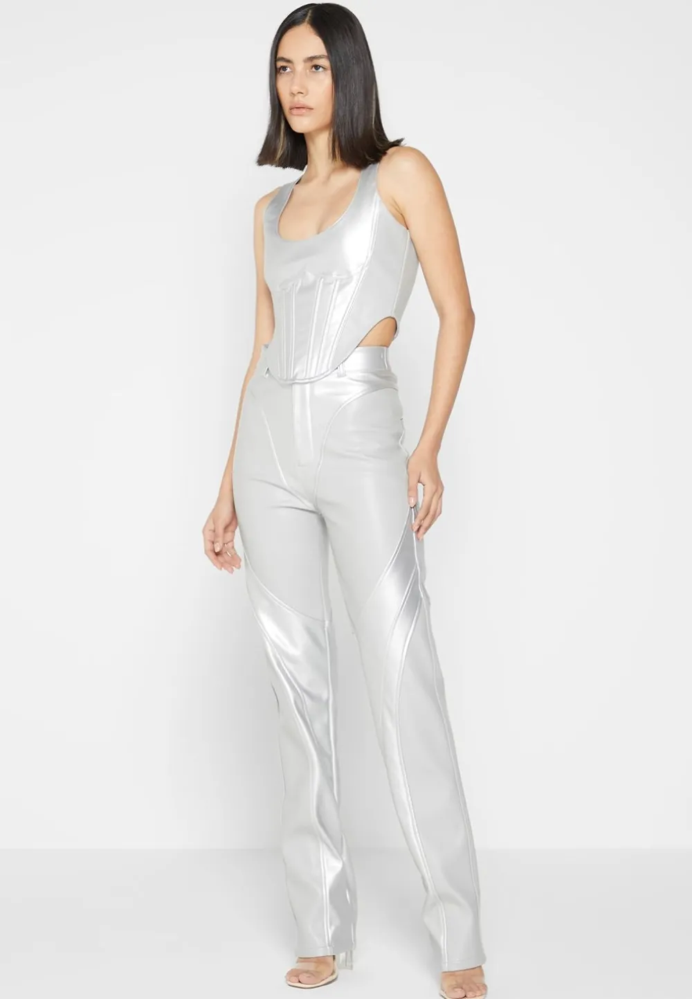 All Eyes Will Be On You With This Vegan Leather Metallic Set. The Slim Fit Combined With The Contrast Panelling Creates A High Fashion Look Desirable For Any Occasion.