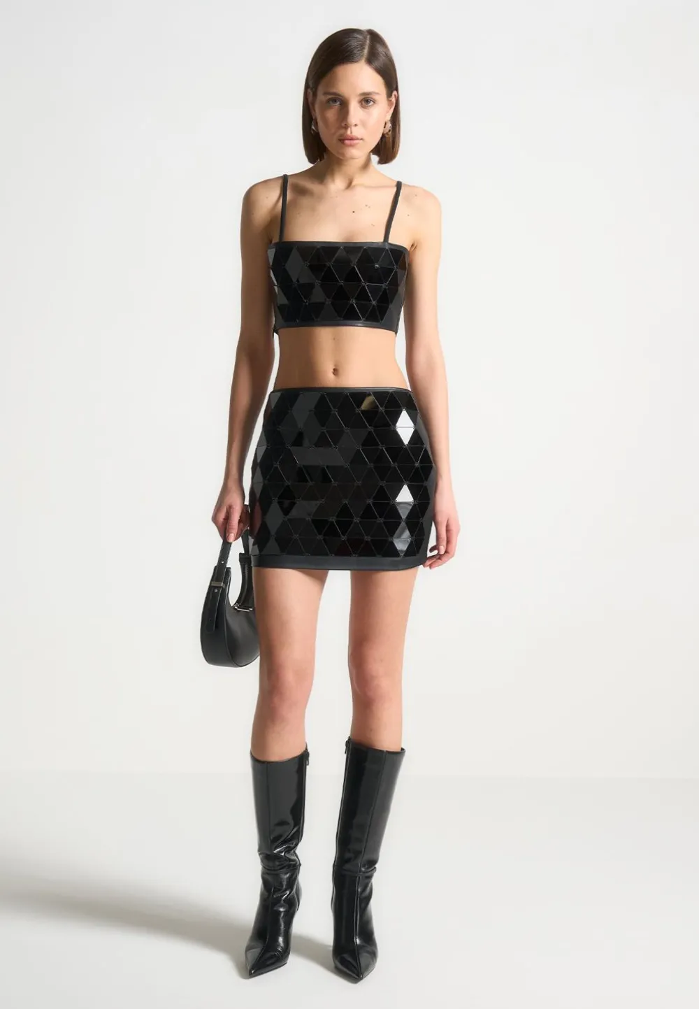 This Mini Skirt Is Crafted From Luxurious Vegan Leather And Beautifully Embellished With Unique Mirrored Accents, Ensuring You Stand Out In Any Crowd. Add A Statement To Any Outfit With This Chic, Stylish Piece.