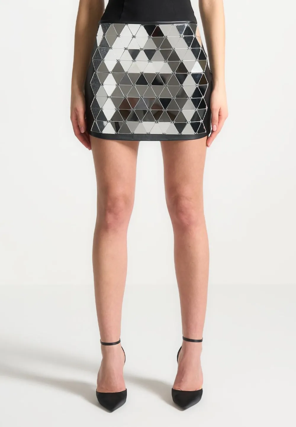 This Mini Skirt Is Crafted From Luxurious Vegan Leather And Beautifully Embellished With Unique Mirrored Accents, Ensuring You Stand Out In Any Crowd. Add A Statement To Any Outfit With This Chic, Stylish Piece.