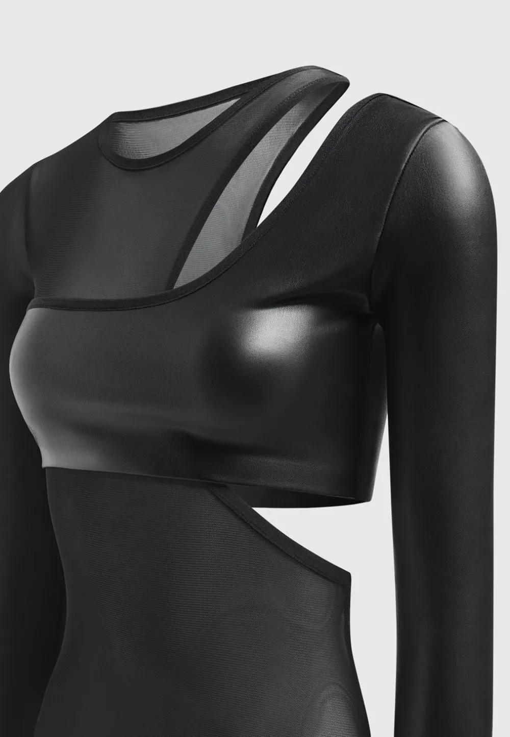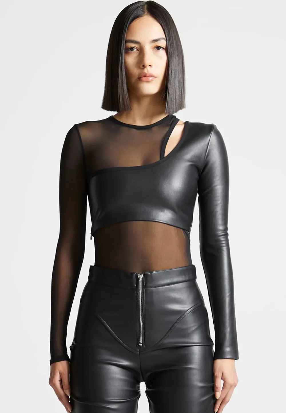 Our Vegan Leather Overlay Mesh Bodysuit Is Designed To Make A Statement. Crafted With A Unique Combination Of Vegan Leather And Mesh, This Piece Is Sure To Stand Out. The Look Of Luxury Meets The Comfort Of Breathable Fabric – Perfect For An Evening Out.