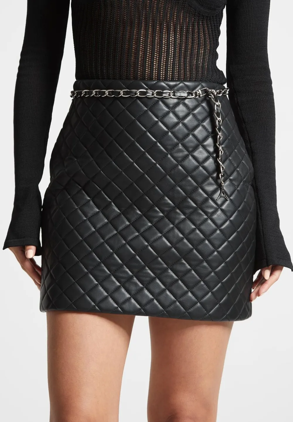 This Vegan Leather Mini Skirt Is Designed For Fashion-Forward Style. The Classic Quilted Pattern Features A Unique Chain Detail With A Bold, Black Finish. Elevate Any Look With This Luxurious Skirt.